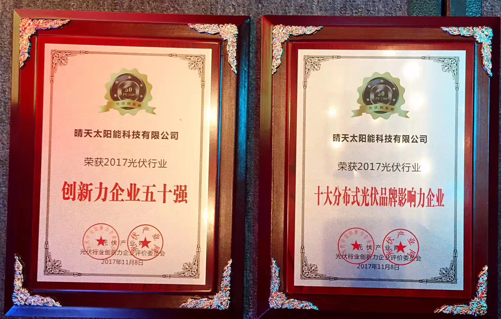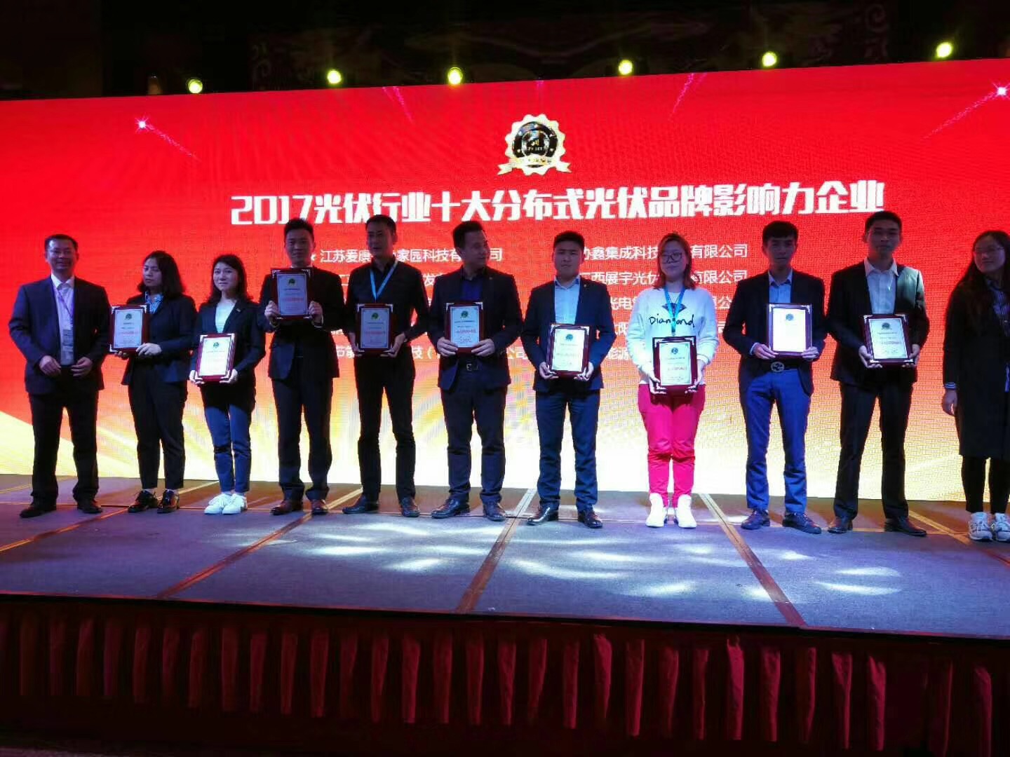 閃耀PVIC2017光伏創新大會! 以優秀的分布式(戶用+工商業)光伏電站開發能力,卓越的光伏服務品質以及不斷創新的企業經營理念,榮獲“2017光伏行業創新力企業五十強”、“2017光伏行業十大分布式光伏品牌影響力”兩項大獎,成為本年度的“創新”標桿企業!
